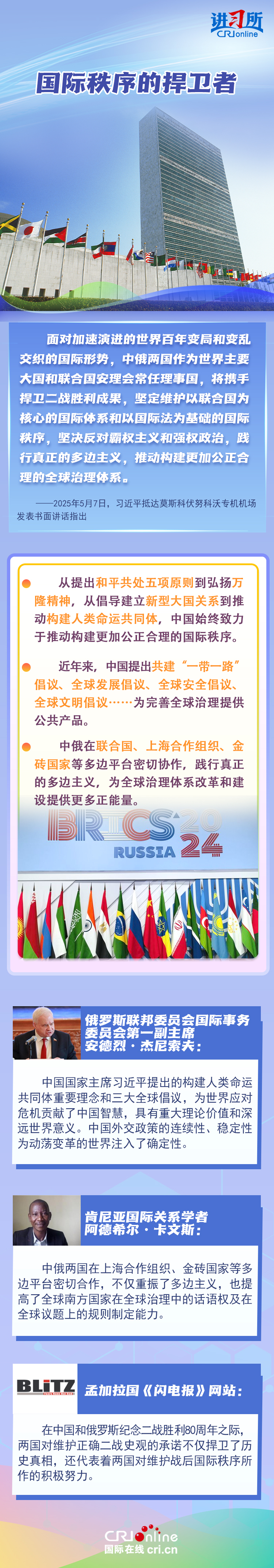 “两国人民用鲜血和生命凝结的深厚情谊,如黄河之水奔腾不息,似伏尔加河宽广深沉,成为中俄世代友好的不竭源泉。”今年是中国人民抗日战争、苏联伟大卫国战争暨世界反法西斯战争胜利80周年,也是联合国成立80周年。在这一重要历史时间节点,习近平主席此访不仅为中俄关系发展注入强劲动力,也向世界宣示中俄两国携手捍卫二战胜利成果的坚定意志。