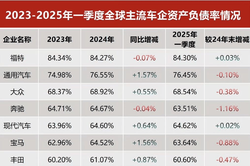 这些数字乍一看确实惊人。但放眼全球,跨国车企2024年负债率也同样高得惊人:福特84.3%,通用76.6%,大众68.9%,奔驰64.7%。就连被视为财务健康典型的特斯拉,负债率也有39.6%。