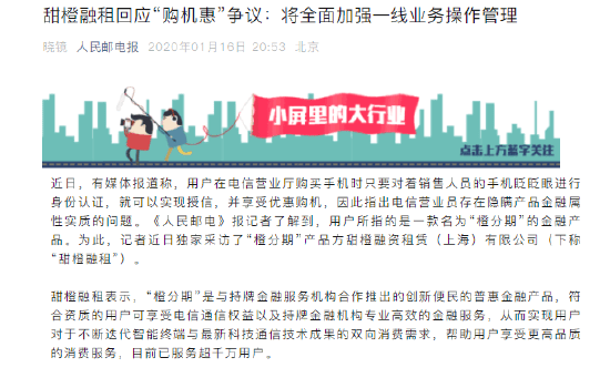 而在前几年,就有媒体报道称,用户在电信营业厅购买手机时只要对着销售人员的手机眨眨眼进行身份认证,就可以实现授信,并享受优惠购机,因此指出电信营业员存在隐瞒产品金融属性实质的问题。对此,甜橙融租曾回应表示,将全面加强一线业务操作管理。