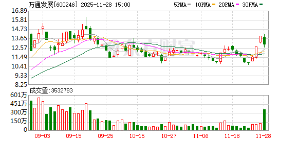 近期A股市场整体走势震荡,万通发展(600246.SH)却走出了独立行情。截至11月27日数据显示,该股近一个月累计涨幅超过22%,其中近两个交易日连续涨停,累计涨幅达19.99%。然而,市场的热烈情绪在11月28日出现明显降温,当日其股价下跌7.38%,收盘报12.92元,显示资金态度正趋于分化。