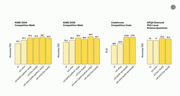 在AIME 2025题目中,两者准确率分别达88.9%和92.7%,在Codeforces编程竞赛评分中,支持终端工具的o3和o4-mini分别取得了2706和2719的ELO分数,领先o1的1891和o3-mini的2073。
