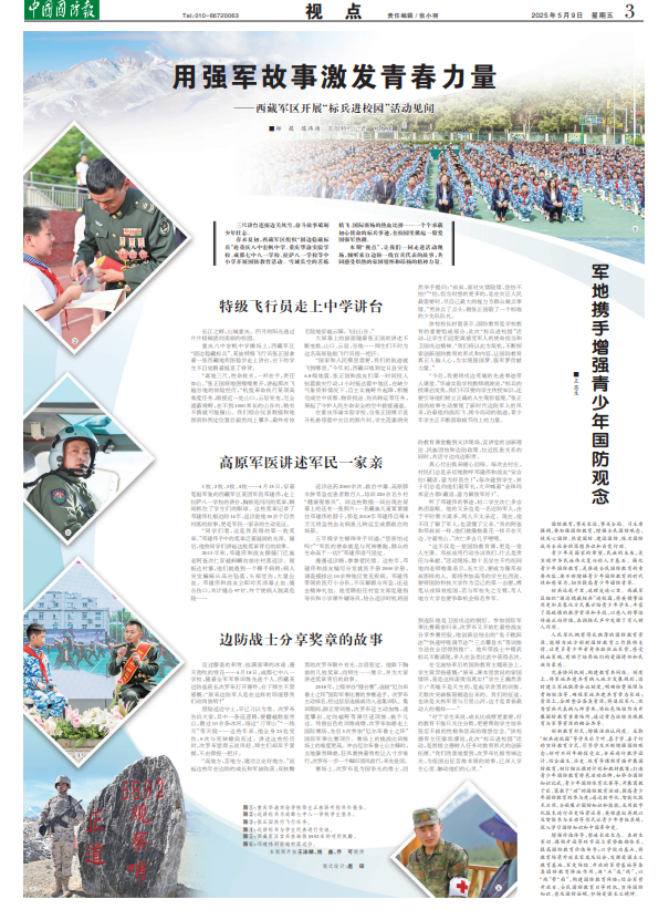 “今后,我要将戍边英雄的先进事迹带入课堂。”华渝实验学校教师胡波说,“标兵的授课启发我,我们不仅要向学生传授知识,还要引导他们树立正确的人生观价值观。”张正国的故事生动展现了新时代边防军人的风采,沿着他向战而飞、闻令而动的航迹,青少年学生正不断汲取拔节向上的力量。