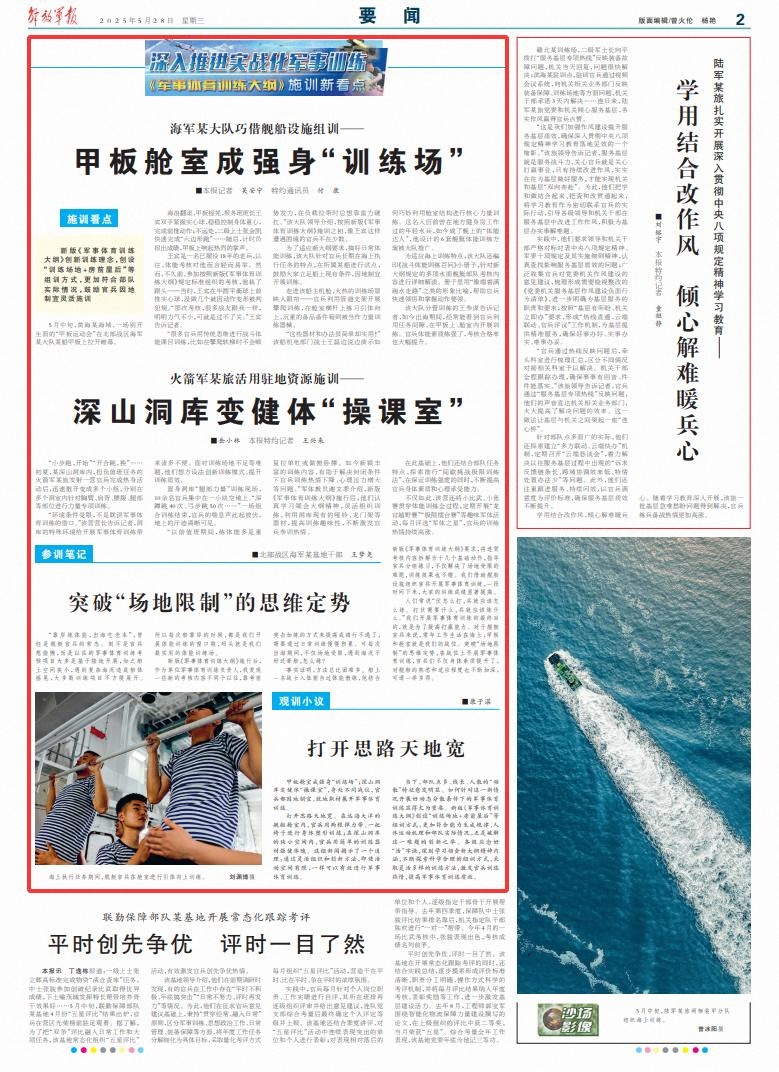 打开思路天地宽。在远海大洋的舰艇舱室内,官兵用两根弹力带、一把椅子进行身体塑形训练;在深山洞库的狭小空间内,官兵用简单的训练器材强健体魄。这组新闻揭示了一个道理:通过灵活组织和创新方法,即便活动空间有限,一样可以有效进行军事体育训练。